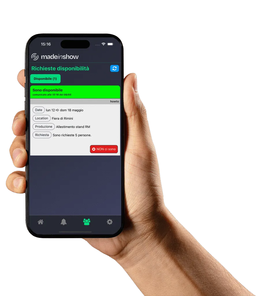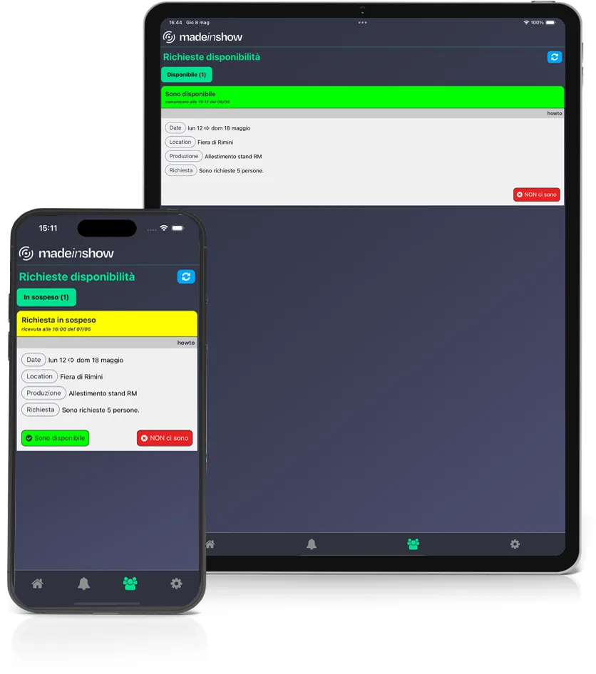 Made in Show è un compagno che ti segue ovunque ed è soprattutto nei momenti più frenetici e di fronte ai problemi dell’ultimo minuto che sa dare il meglio di sé. Aggiornare immediatamente tutto il team di lavoro, modificare orari, trasferire e sostuituire l’attrezzatura tecnica, riorganizzare tecnici e collaboratori, rispondere alle richieste dei clienti.